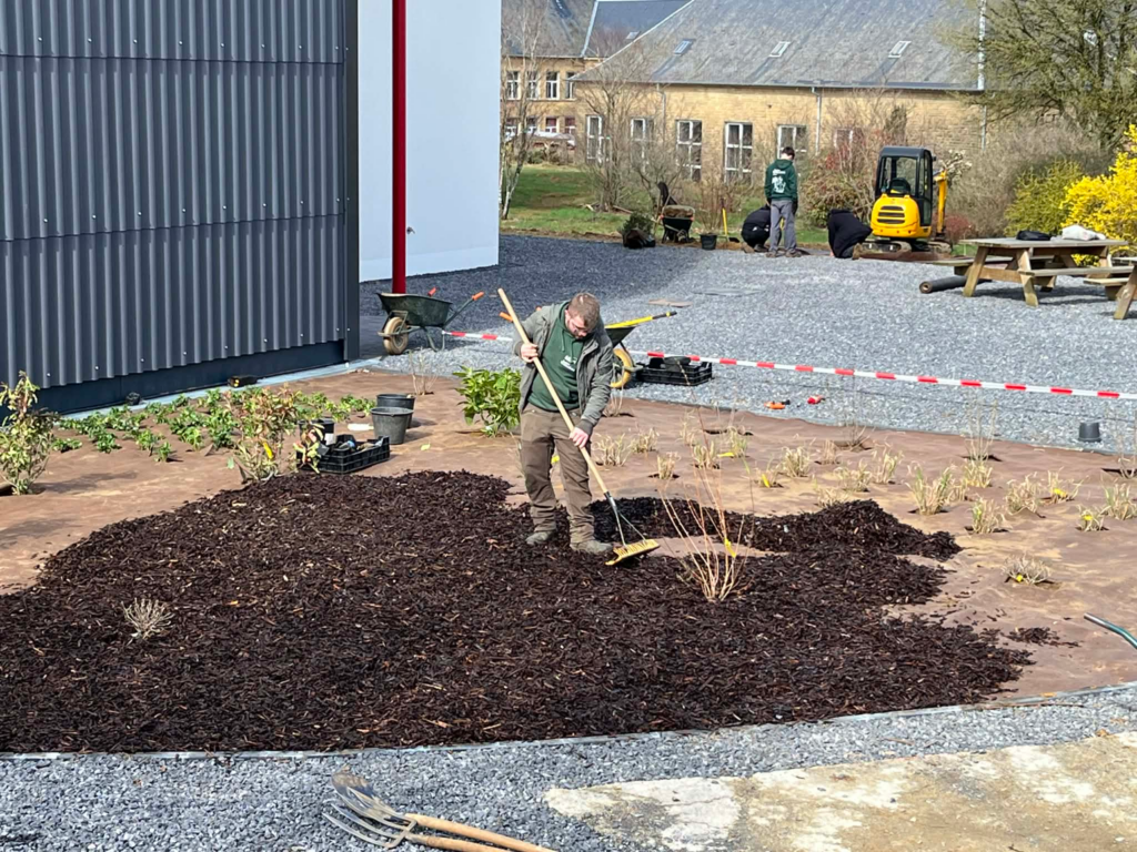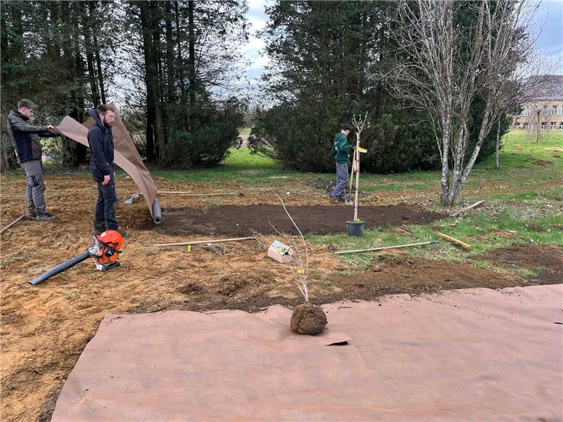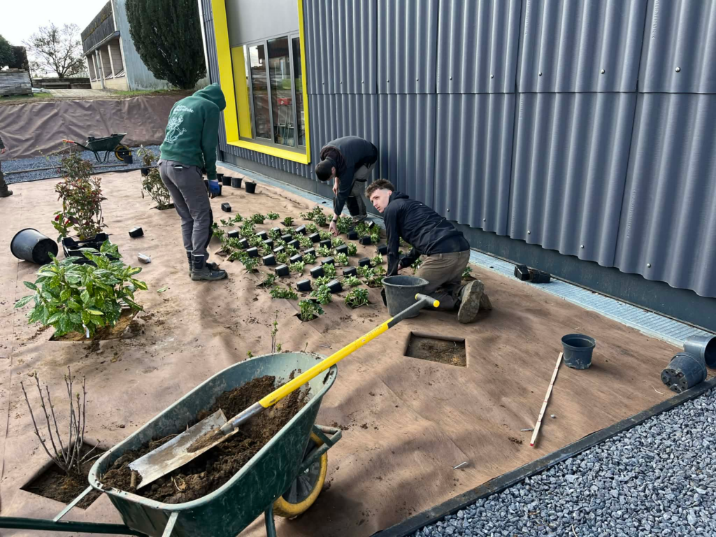 Au programme, amélioration du sol avec du compost maison, mise en place de toile de plantation, plantation et mise en place de paillage.