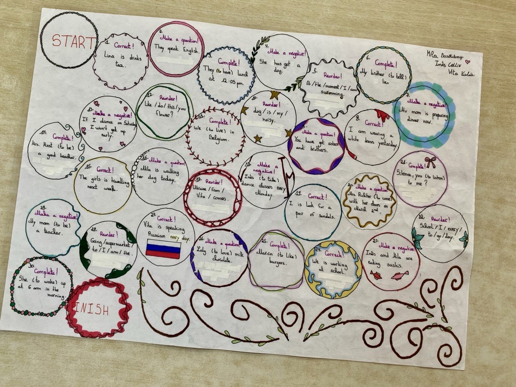 Dans le cadre du cours de conversation anglaise, les élèves de 2C ont été amenés à réaliser des jeux de plateau sur le thème du « Present simple / Present continuous ».